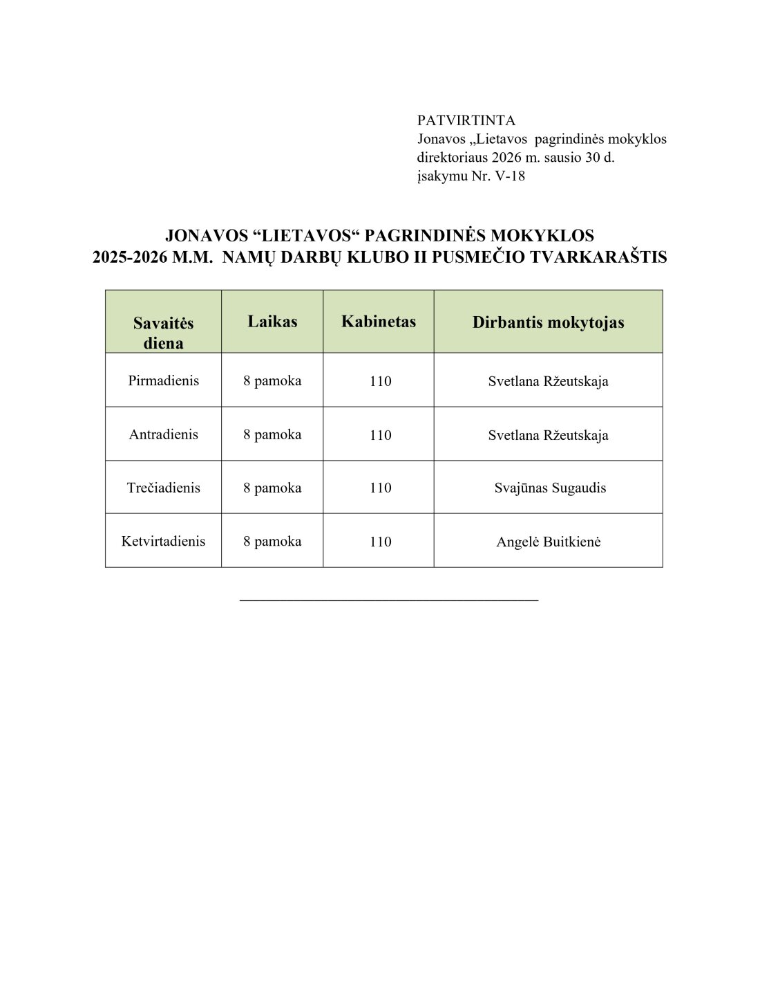 Namų darbų klubo darbo laiko tvarkaraštis 2025-2026 m. m. II pusmetis