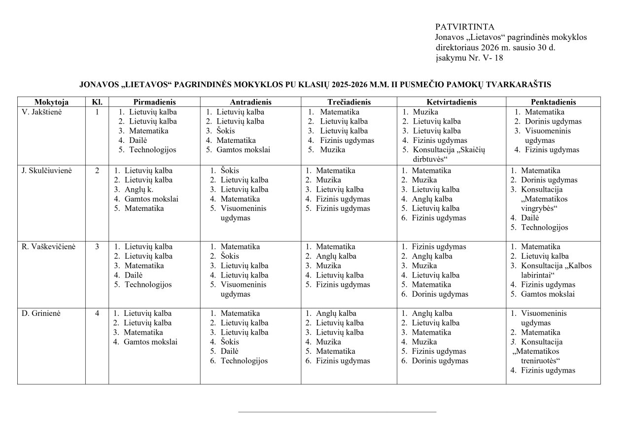 Pamokų tvarkaraštis 1-4 klasių 2025-2026 m. m. II pusmetis